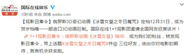 国际在线1+1观影团邀请全国网友欣赏《冰雪女皇之冬日魔咒》,快来参加活动,看电影吧!