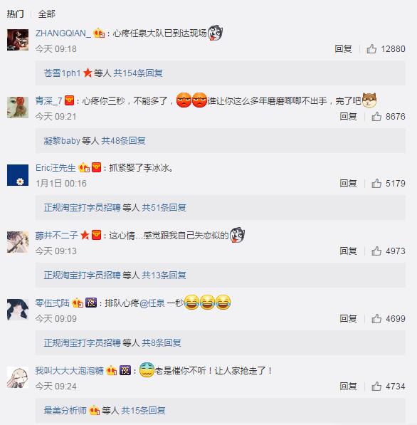 网友们看到这样的消息立即变得不淡定。在23年前,任泉和李冰冰就相识,同学与老乡的他们开始了“革命情”。此前,任泉在某节目中还说“她未嫁我未娶就一起过”。网友们纷纷到任泉微博留言:“让你磨磨唧唧不出手,晚了吧”、“还有时间,快娶了李冰冰”、“心疼你三秒,不能多”。