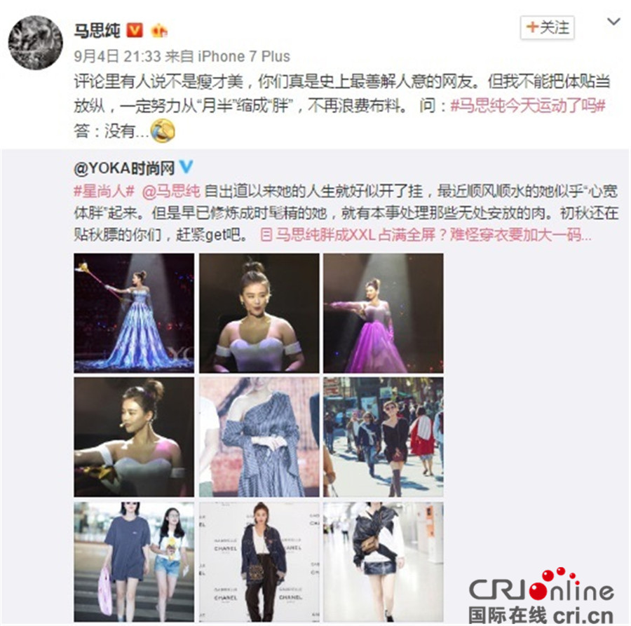 对此,耿直girl马思纯毫不避讳,居然转发微博回应道“评论说不是瘦才美,你们真是世上最善解人意的网友。但我不能把体贴当放纵,一定努力从‘月半’缩成‘胖’,不再浪费布料”。最后还自问“马思 纯今天运动了吗?答:没有……”一番高情商的回应狂拉好感,被网友赞“幽默不失真诚”,“既有女演员保持观感的自觉也有普通女生减肥的现实懒惰,小马哥的回应满分!”“整个回复大方有趣,好可爱啊!“”好可爱的纯纯!这是要打卡运动的节奏吗?”