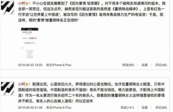 6月23日晚,音乐人小柯通过微博怒斥格力董事长董明珠侵权他的作品《因为爱情》,用来“贩卖”电饭锅,称:“不小心在朋友圈看到了《因为爱情 饭煲篇》。对于很多个被网友戏谑填词的版本,我全部一笑而过,但这次点开,赫然发现刊载这首歌的竟然是《董明珠自媒体》,上面有红色一行字迹‘让世界爱上中国造’,被改写的《因为爱情》是用来售卖格力生产的电饭煲!于是,就这样,我的‘爱情’被董明珠名正言顺的‘煲’了!在没有任何告知和沟通下,格力电器直接用我的‘爱情’卖她的‘中国制造’,我彻底无语并出离愤怒。拜托,你能尊重一下我的‘爱情’吗?!你能尊重一下也同属‘中国制造’的音乐版权吗?!”