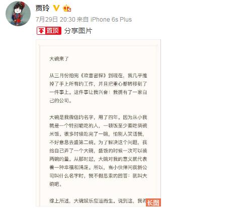 原来,贾玲昨晚微博置顶分享了一篇长微博,宣布自己与合伙人创建了一个名为“大碗娱乐”的传媒公司,立志为国产喜剧贡献力量。而邓超则跟着陈冠希与林志玲间骂战的热潮,模仿陈冠希来调侃一番,为好朋友贾玲的新工作做宣传。