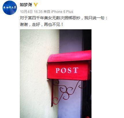 10月4日下午,《跑男》推广总监如梦尧发博称:“对于某四千年美女无数次捆绑恶炒,我只说一句:谢谢,走好,再也不见!”鞠婧祎则在之后发文:“黑人问号脸???”疑似对此事进行回应,表明自己并不知情。