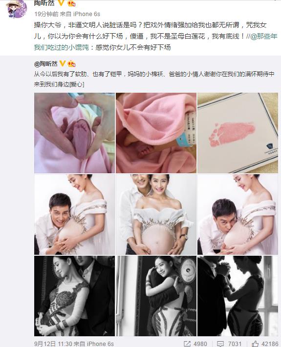 凤凰娱乐讯 10月8日,“安陵容”陶昕然转发网友对她孩子“感觉你女儿不会有好下场”的评论,在微博狂爆粗口:“非逼文明人说脏话是吗?把戏外情绪强加给我也都无所谓,咒我女儿,你以为你会有什么好下场,我不是圣母白莲花,我有底线!”
