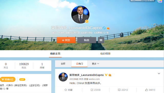 莱昂纳多·迪卡普里奥开通微博:Hello,China!