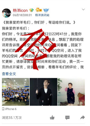 杨洋被人假冒身份开账号 骗取粉丝大量钱财