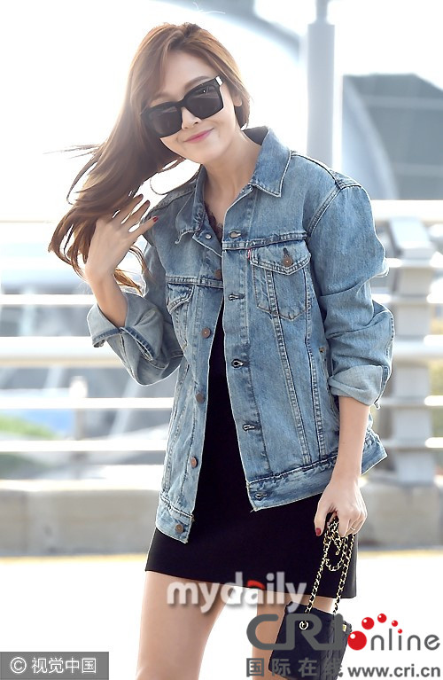 韩国仁川,10月1日,韩国女艺人郑秀妍Jessica为了在国外的工作日程而从仁川国际机场启程飞往了新加坡,她身穿小黑裙晒美腿,戴黑超风中狂撩发。