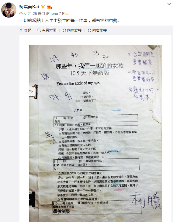10月22日晚,柯震东在微博晒出一张《那些年》剧本照,并写道:“一切的起点!人生中发生的每一件事,都有它的意义。”照片中,可以看出熟悉的场景和对白,还有柯震东做的笔记,引发众人回忆。