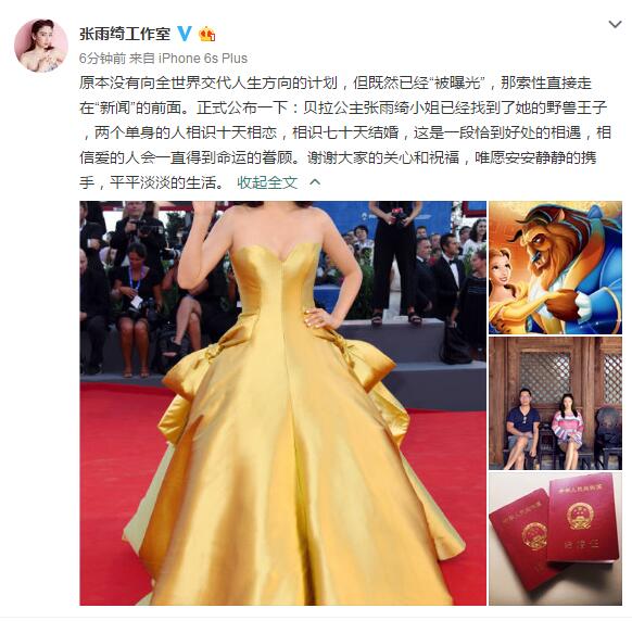 原本没有向全世界交代人生方向的计划,但既然已经“被曝光”,那索性直接走在“新闻”的前面。正式公布一下:贝拉公主张雨绮小姐已经找到了她的野兽王子 ,两个单身的人相识十天相恋,相识七十天结婚,这是一段恰到好处的相遇,相信爱的人会一直得到命运的眷顾。谢谢大家的关心和祝福,唯愿安安静静的携手,平平淡淡的生活。