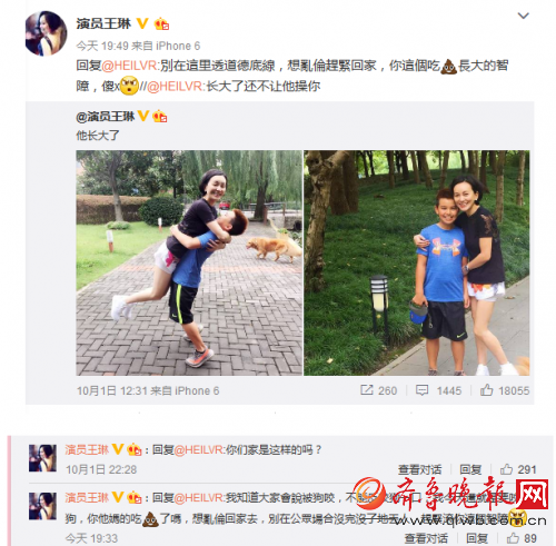 近日王琳通过微博晒和儿子亲密照,并感慨“他长大了!”照片中儿子十分的帅气。然而有网友却在微博评论里写下不雅留言:“长大了还不让他x你。”此毁三观评论也惹怒王琳,并手撕网友回骂道:“我知道大家会说被狗咬,不能反咬狗一口,我今天还就是要咬狗,你他妈的吃SHI了吗,想乱伦回家去,别在公共场合没完没了的丢人,赶紧滚你这个智障。”