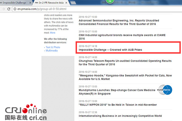 10月30日晚8点,由央视综合频道和央视创造传媒联合制作的大型励志挑战节目《挑战不可能》第二季在央视一套播出。首期节目播出完毕,血迹犬“草根儿”“弹簧腿跳绳少年”岑小林等成为了街头巷尾热议的项目。而早在开播前《挑战不可能》在第53届亚洲太平洋广播联盟中以绝对的优势从亚洲-太平洋地区的众多知名节目脱颖而出,获得了电视娱乐节目类大奖。这也是中国电视综艺节目在“亚广联”上获得的首个原创类节目大奖。这次不一样的是,包括美通社亚洲和推特亚洲等在内百余家的国际媒体与国内媒体几乎同步刊发了《挑战不可能》这一中国原创综艺节目荣获国际大奖的消息。