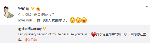随后张伦硕回复:“love you ,我们明天就回家了。”