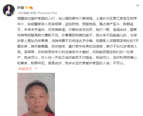 提醒各位爱护家园的人们,当心提防黑中介黑保姆。上海长宁区愚江家政王莉萍中介,安徽籍家政人员李明翠,盗抢财物、损毁物品、强占房产至今,数额逾万,本来未予追究,仅将其辞退。尔等却变本加厉,倒打一耙、造谣讹诈,警察将其带回警局数次屡教不改。你看看田牧宸的案子,我从来不怕碰瓷儿的,为保护家人更加无所畏惧,法院传票不日将送达予你等。另据家人邻居跟李相处的7天里反映,其衣着暴露、浓妆艳抹、虐打家中收养的流浪狗,言行不似52岁家政人员。李明翠,你向我哭诉中介的住宿条件太差时,问我能否租住我们的一处房产,我说可以,你入住一天后又说你能否不付租金,我说可以,但你利用同情心和善良,数罪并犯、妄图讹诈,我会永远代表爱护家园的人说:不可以。