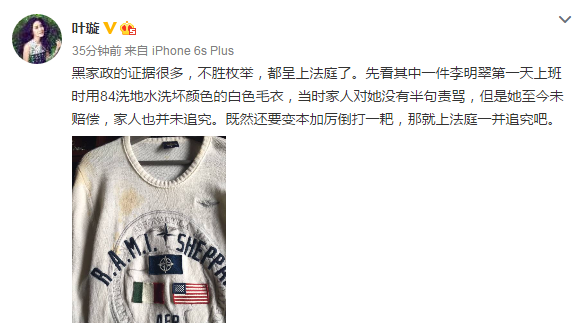 11月7日,叶璇晒出一件有明显污渍的毛衣,附文称“黑家政的证据很多,不胜枚举,都呈上法庭了。先看其中一件李明翠第一天上班时用84洗地水洗坏颜色的白色毛衣,当时家人对她没有半句责骂,但是她至今未赔偿,家人也并未追究。既然还要变本加厉倒打一耙,那就上法庭一并追究吧。”
