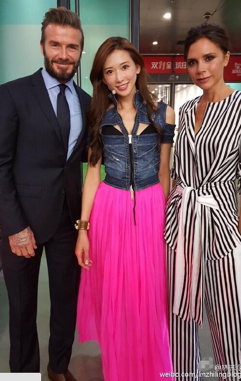 11月10日,双11晚会在浙江卫视播出,贝克汉姆一家、科比、张艺兴、TFBOYS等一众明星出席high翻狂欢夜,参加当晚活动的林志玲在微博中晒出与小贝夫妇的合影,合影中林志玲身穿粉裙站在小贝夫妇中间,三人看起来十分亲密。