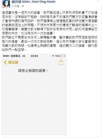 据台湾媒体报道,谢欣颖5日突然到梁士华家中,发现不是她所有的女性内衣,男方也承认自己做了不对的事。事实上,谢欣颖早在2014年就已经答应梁士华求婚,婚纱照也早已拍好,10日却在脸书表示自己做了最困难也很重要的决定,“我和梁先生因彼此价值观的不同,在经过讨论下已协议停止有关婚礼淮备。很抱歉让大家失望了,但请不要为我担心,我很好,也很感谢梁先生这些年为这段感情做的努力。”梁士华也在脸书上回应:“我会很好,不会输给你的,这些日子谢谢你。”