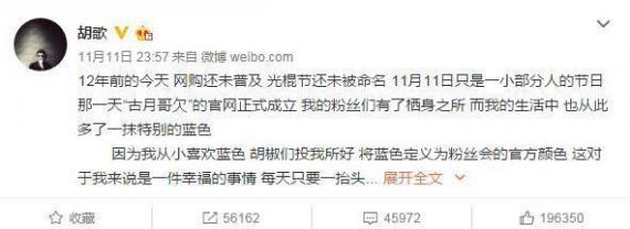 胡歌在微博中写道:“都说十二年是一个轮回,今年是“古月哥欠”的本命年,也是我浴火重生的第十年,此时此刻 除了要表达我对你们的感谢,我更想在这里和你们展望一下属于我们的未来。”