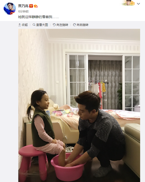 网易娱乐专稿11月17日报道 今早,贾乃亮在微博晒出自己为女儿甜馨洗脚的照片,甜馨乖乖的端坐在椅子上,认真又深情的望着贾乃亮,画面十分温馨。他配文表示:“她就这样静静的看着我……”