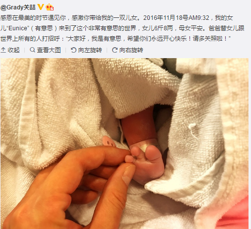 今日,歌手关喆发文称妻子顺利产下一女:感恩在最美的时节遇见你,感激你带给我的一双儿女。2016年11月18号AM9:32,我的女儿“Eunice”(有意思)来到了这个非常有意思的世界,女儿6斤8两,母女平安。爸爸替女儿跟世界上所有的人打招呼:“大家好,我是有意思,希望你们永远开心快乐!请多关照啦!”2014年10月29日,关喆的儿子出生,关喆也在微博报喜,并晒出爱子的小脚丫和网友一起分享喜悦。此次关喆再得一女,难掩激动之情。