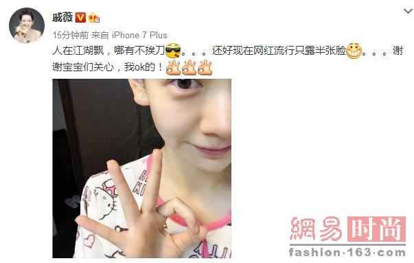 戚薇在拍戏的过程中不慎被铁片划伤脸部,晒晒半张脸报平安,戚薇称:人在江湖飘,哪有不挨刀。戚薇的素颜照还是很美的,发现七哥就算是当了妈也藏不住的一颗少女心,身上的衣服竟然是HelloKitty真实太少女了。