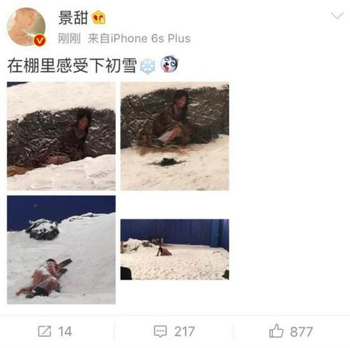 景甜11月21日在微博晒出了几张照片,并贴出:在棚里感受下初雪!网友们纷纷表示差点就相信了,女神太会玩了。