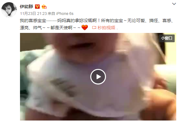 11月23日晚,伊能静在微博晒女儿开心大笑的视频,并写道:“我的喜感宝宝,妈妈真的拿你没辙啊!所有的宝宝,无论可爱、搞怪、喜感、漂亮、帅气……都是天使啊!”