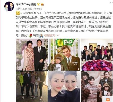 57岁向太今日在微博自曝将动心脏手术,却也因此想到好多事还没做完,包括没看到儿子娶妻生子、两栋建筑工程没完成、也没过拍婚纱,更透露曾答应过老公向华强虽不能同年同月同日生,“但是要走时一起同时走的”。