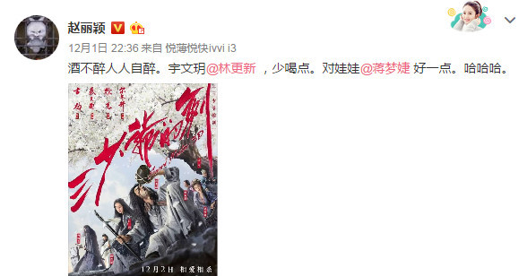 昨日(12月1日),赵丽颖晒出一张《三少爷的剑》的海报,附文称“酒不醉人人自醉。宇文玥@林更新 ,少喝点。对娃娃@蒋梦婕 好一点。哈哈哈。”