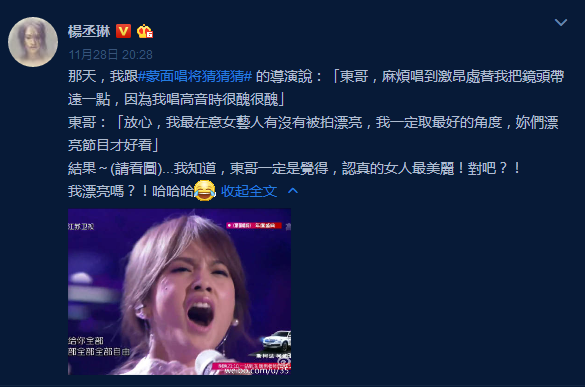 随着《蒙面唱将》的热播,杨丞琳因为在节目上精彩的演出深受大家喜爱。但是在前几日,她就发了一篇自己与导演的聊天记录,记录中显示杨丞琳请求导演将她拍的美美的,导演也保证取最好的角度,但是镜头还是让她尴尬不已。杨丞琳无奈的表示“认真的女人最美丽,对吧。”并自黑放了一张自己“高音很丑很丑”的截图。