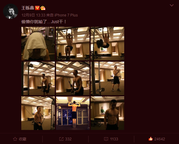 昨日,歌手王栎鑫连发九张秀肌肉照片并配文“偷懒你就输了…Just干!”,惹得一片迷妹大呼:“已婚人士请不要天天撩妹! ”