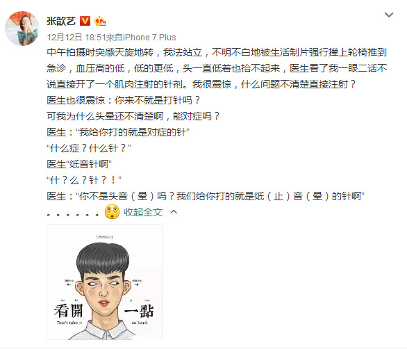 昨日(12月12日),张歆艺发文称自己在拍戏时,突感天旋地转,无法站立,被送去急诊。医生看了她一眼二话不说直接开了止晕针,让她十分无奈。今日,张歆艺再次发文斥责医生不尊重病人生命,拿病人生命开玩笑。