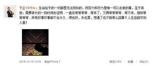 近日,有爆料称电视剧《凤囚凰》男女主角均被换角引发风波。12月19日,于正发布微博:“得也好,失也罢,想通了也不就那么回事?人生岂能尽如人意!”疑似有感此前盛传《凤囚凰》杨蓉角色被换事件。