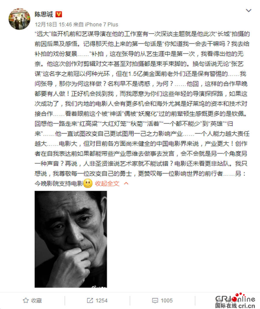 张艺谋新作《长城》已于12月16日在国内公映,首周末三天狂揽4.7亿票房,单片带动中国电影市场同比增长3成,同时仅凭国内票房就在全球票房榜上排名第二,仅次于海外54个市场率先上映的《星球大战外传:侠盗一号》,截至19日19时,影片4天不到票房已突破5亿。而与市场上的鲸吞之势形成鲜明对比的,是电影在影评界的“被围攻”处境,甚至有影评人喊出了“张艺谋已死”的言论,引出电影出品方之一不满,直接附上声明要求删除。近日,“长城论战”再度升级,惊动了多位导演,陆川、陈思诚、让·雅克·阿诺几位知名导演从各个渠道表态支持张艺谋。