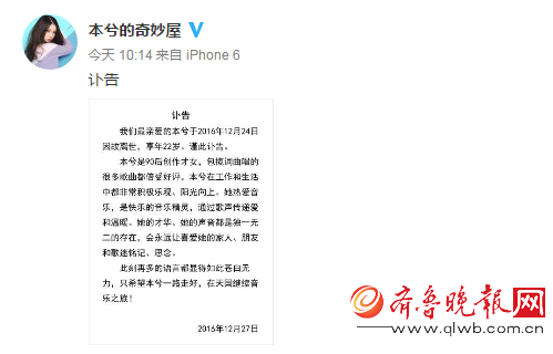 据本兮工作室“本兮的奇妙屋”消息,90后歌手本兮于12月24日去世,得年22岁。关注她的粉丝大多表示事情太过突然,无法接受。