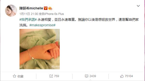 凤凰网娱乐讯 11晚,陈妍希在微博晒出一张与爱子手牵手的照片,并写道:“我们承诺永远相爱,并且永远尊重。无论你以后是想拯救世界,还是帮咱们家洗碗。”