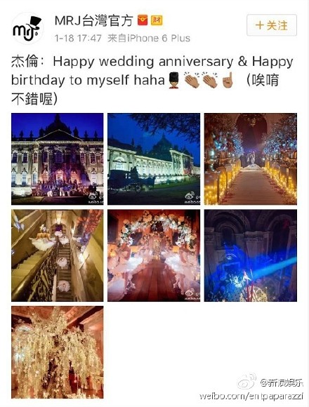1月18日,周杰伦更新微博庆祝自己38岁生日和结婚两周年纪念日。在微博中,周杰伦写道:Happy wedding anniversary &Happy birthday to myself haha(结婚纪念日快乐,生日快乐),并调皮地配上自己的口头禅:哎唷不错喔!并发布了7张当年城堡婚礼的照片,其中有一张是他和昆凌婚礼上的背影,看上去特别梦幻。今年1月18日是周杰伦38岁生日,两年前的1月17日,周杰伦和昆凌在英国举行婚礼。