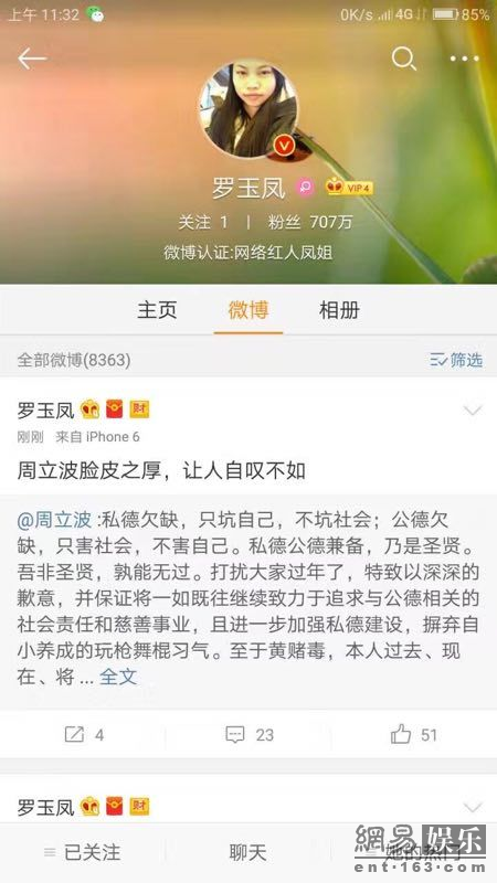今天中午,罗玉凤转发了周立波的此条微博并评论道:“周立波脸皮之厚,让人自叹不如”,疑似对周立波的言辞及人品颇为不屑。