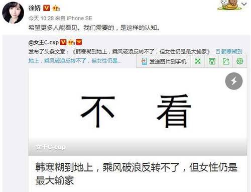 韩寒新电影歌词惹争议,娱乐圈的艺人自然是各有各有的考量,但是徐娇“一意孤行”,第一条转发微博批评歌词对女性的不尊重。