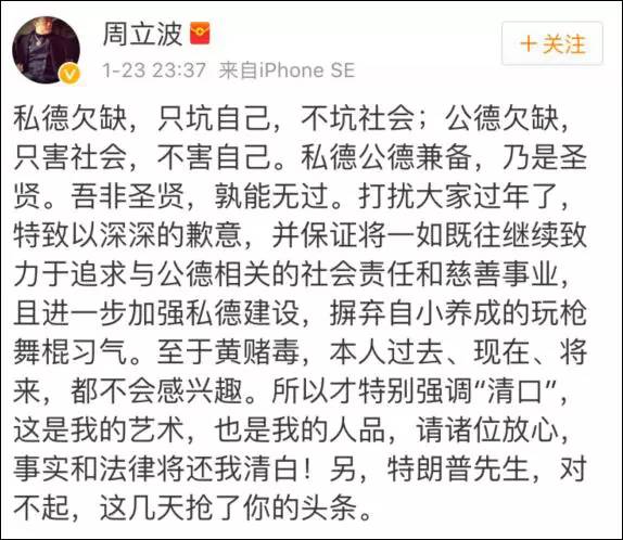 日前,周立波在美国长岛因涉嫌持有枪支、藏有毒品而被美国警方逮捕一事备受多方关注,此前周立波在缴纳了保释金之后已经获得保释。昨晚,周立波在保释后首次通过微博发声, 先是对其引发的事件和骚动致歉,并再次自陈清白,其表示“要进一步加强私德建设,摒弃自小养成的玩枪舞棍习气。至于黄赌毒,本人过去、现在、将来,都不会感兴趣”,更表示“事实和法律将还我清白”。