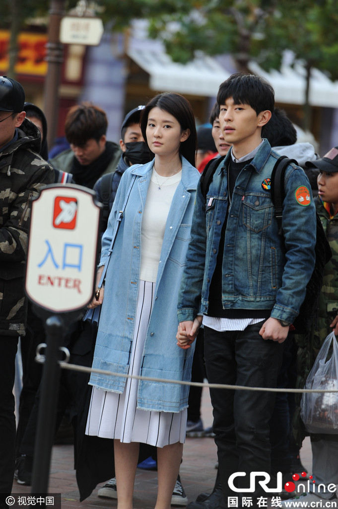 上海,近日,“五美”之一的乔欣和邓伦来到上海迪士尼乐园拍摄电视剧《欢乐颂2》,两人组成小情侣CP,穿着清凉的夏装拍戏,手牵着手十分登对。两人在寒风中拍戏,众多游客在一旁围观拍照。休息间隙,乔欣赶紧裹上包身羽绒服取暖。