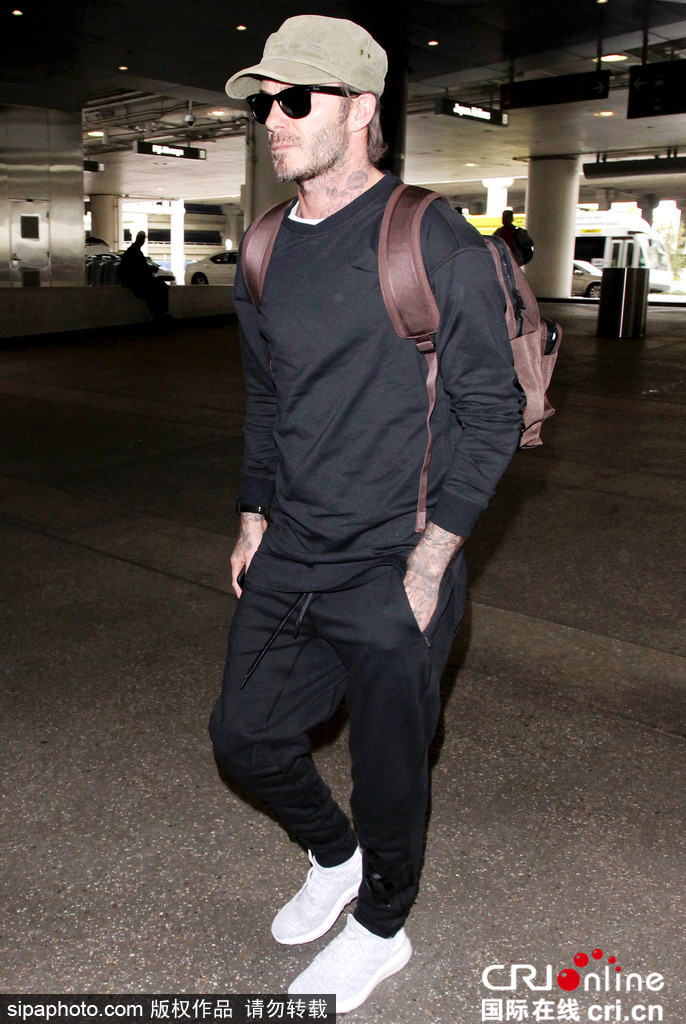 美国洛杉矶当地时间2017年2月2日,大卫·贝克汉姆(David Beckham)现身机场。贝克汉姆“戴着绿帽”,黑超遮面,酷劲十足。图片来源:Sipaphoto