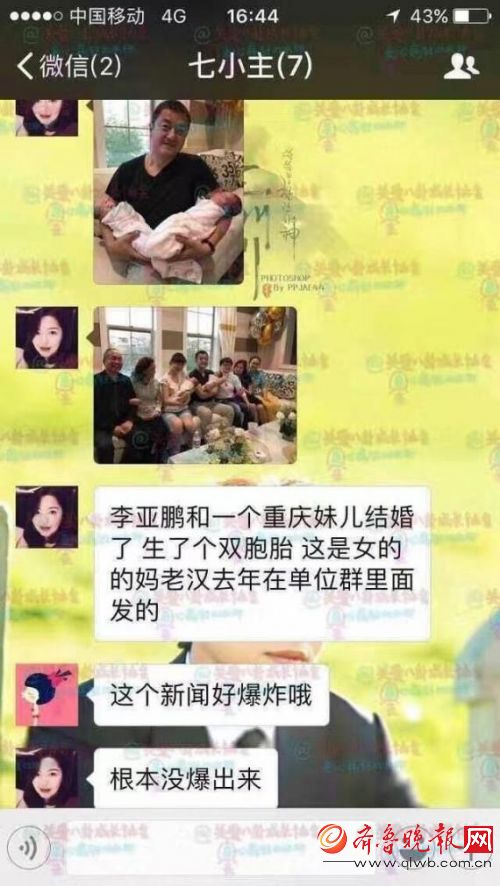 近日,据“关八”,有网友晒出聊天记录称,李亚鹏和一个重庆妹子再婚,并且生了一对双胞胎。截图中还有两张照片,第一张是疑似李亚鹏的男子怀抱双胞胎,第二章则是一张全家福。