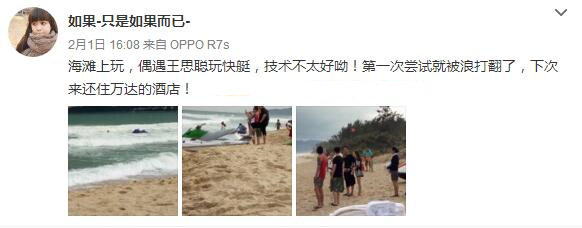 该网友还表示偶遇王思聪玩快艇,技术不太好,第一次尝试就被浪打翻了。