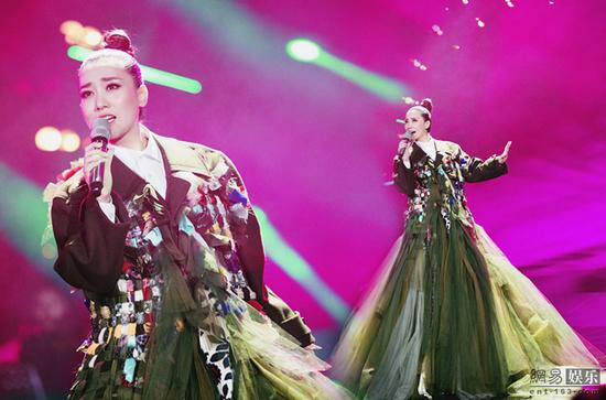 看得出谭晶为此次出征《歌手》,做了从演唱到造型等全方位的充分准备。即上一场《九儿》黑白翅膀礼服惊艳荧屏之后,第三期谭晶又出奇招,突破性地选择穿上了一件十分“另类”的演出服——一件由色彩图案各异的布料编织而成的廓型外套,这件外套同时还是薄纱大裙摆裙装,这件外形夸张的演出服实际大有来头,正是Viktor & Rolf 2016/17秋冬的高定,谭晶穿着它在舞台上甫一亮相,即令全场响起炸裂般的欢呼,仿佛一场华丽的冒险即将随着谭晶的歌声启程,令人充满期待。