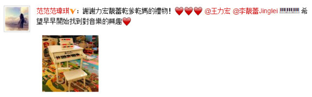 凤凰网娱乐讯今日(2月9日),范玮琪晒出王力宏夫妇送给飞飞、翔翔的儿童钢琴,附文称“谢谢力宏靓蕾干爹干妈的礼物!希望早早开始找到对音乐的兴趣。”