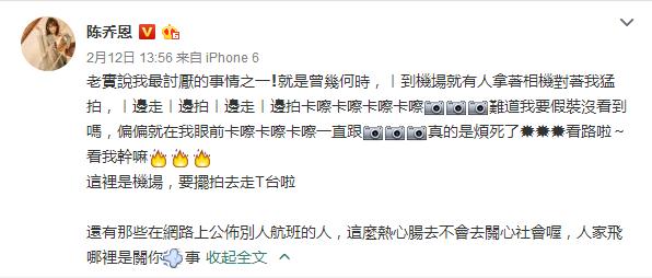 人民网北京2月13日电 (艾雯) 近日,陈乔恩节后搭飞机现身机场照片曝光,小腹微凸的她貌似春节期间发福变圆润。随后她本人针对报道发微博,火爆怒怼偷拍及公布航班信息者,展真性情本色。