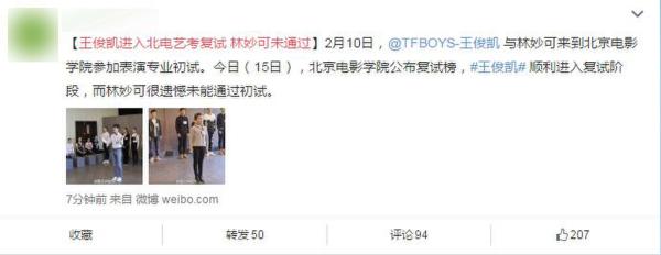 2月15日,有媒体曝出北京电影学院公布复试榜,称王俊凯顺利进入复试阶段,而林妙可很遗憾未能通过初试。