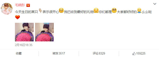 微博中,毛晓彤晒出两张抱着玫瑰花的照片,脸上还被抹上了蛋糕,甜蜜有幸福。她写道:“今天生日的某只表示很开心,我已收到最好的礼物,你们都是,大家都好好的,么么哒。”言语中既有对粉丝的感谢,又充满了对男友的爱意,令人羡慕不已。