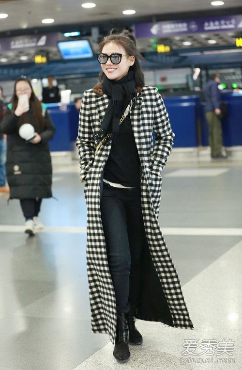 黑白灰经典三色格子大衣,好复古文艺的即视感,马思纯就很偏爱这种清新风格,看起来 特别的清纯迷人。内搭黑色打底衫,穿上紧身裤,一双高跟短靴搞定时尚造型,而且穿超 长款大衣一点都不会显矮呢。