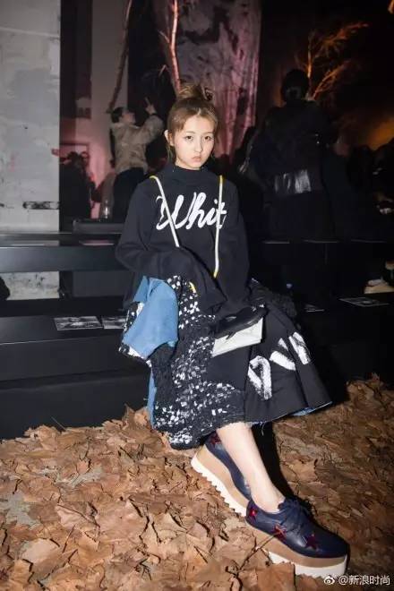 比如这位16岁就来看秀的张子枫同学,看得出来是使了劲儿的:夸张的加长袖卫衣和厚底松糕鞋都是最近爆款。但说到底还是太稚嫩了些,有点像偷穿了大人衣服