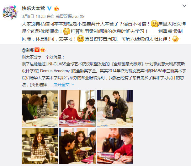 腾讯娱乐讯 昨天(3月9日),谢娜在微博宣布自己获得全额奖学金,将要赴意大利学习设计的好消息,网上瞬间炸开锅,不少网友猜测她是不是要离开《快本》了?消息传开后,《快本》官微发声称:“录制间隙的休息时间去学习。”